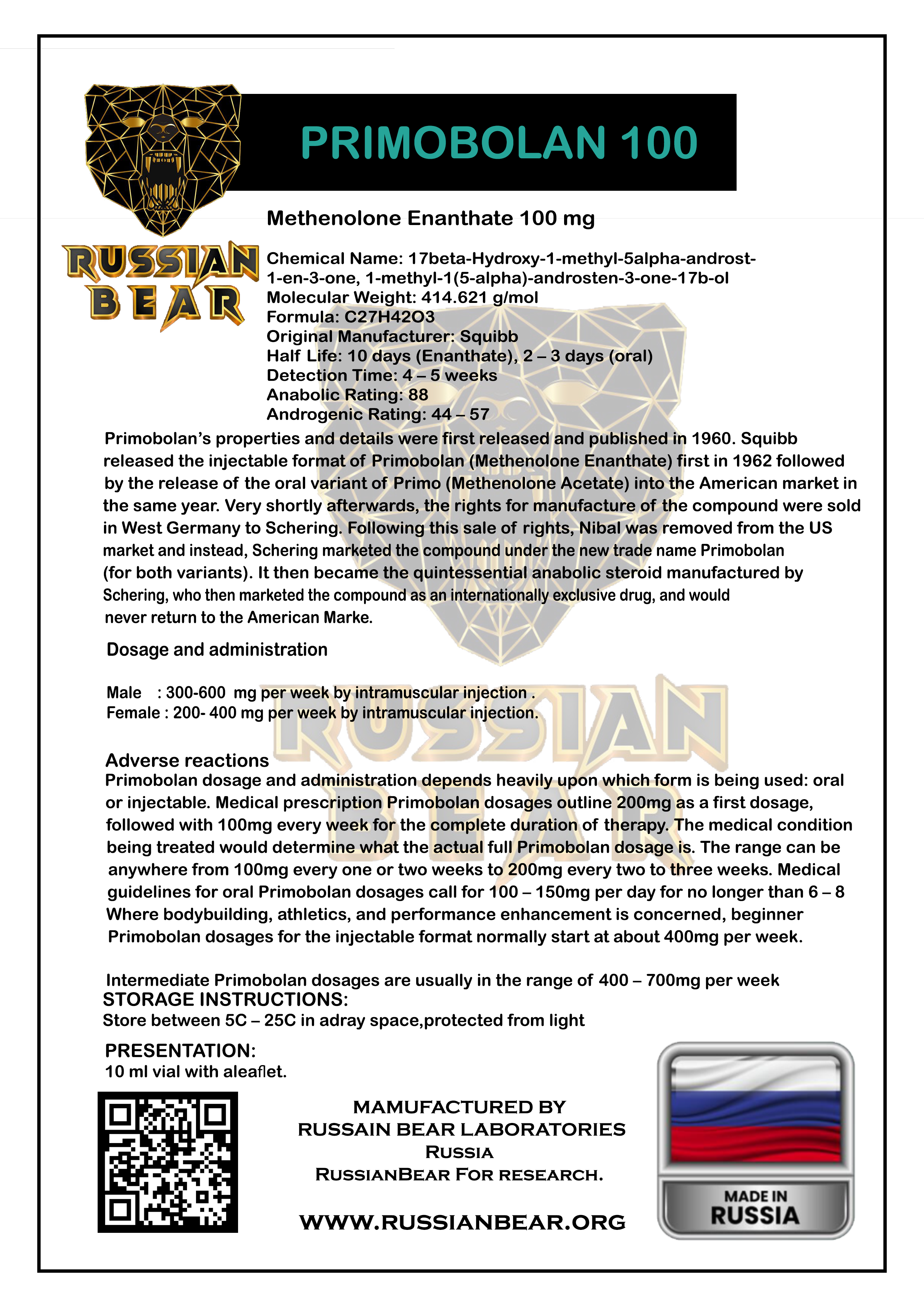 Primobolan’s properties and details were first released and published in 1960. Squibb released the injectable format of Primobolan (Methenolone Enanthate) first in 1962 followed by the release of the oral variant of Primo (Methenolone Acetate) into the American market in the same year. Very shortly afterwards, the rights for manufacture of the compound were sold in West Germany to Schering. Following this sale of rights, Nibal was removed from the US market and instead, Schering marketed the compound under the new trade name Primobolan (for both variants). It then became the quintessential anabolic steroid manufactured by Schering, who then marketed the compound as an internationally exclusive drug, and would never return to the American Marke.